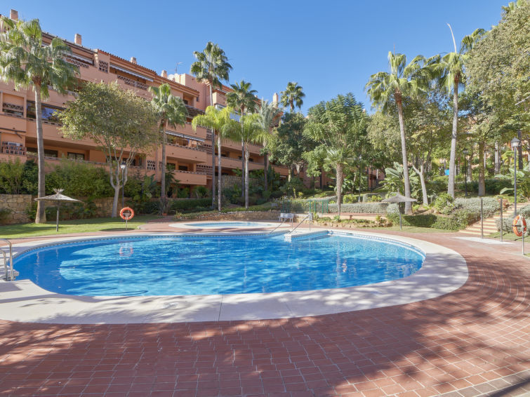 Nagüeles: Petite résidence "Duplex Milla d'Oro". Dans la localité, à 1.5 km du centre de Marbella, situation tranquille, ensoleillée, à 900 m de la mer. En commun: jardin avec pelouse, 2 piscines (profondeur 120 - 150 cm, disponibilité saisonnière: 15.Jun. - 15.Sep.). Douche extérieure. Infrastructures de la Maison: ascenseur. Garage en commun. Arrêt de bus "Montebello" 400 m. Terrain de golf (9 trous) 950 m, tennis 1 km, centre équestre 15 km. Attractions à proximité: Puerto Banus 6 km. Environnement très sensible au bruit. Silence et bonne tenue exigés.