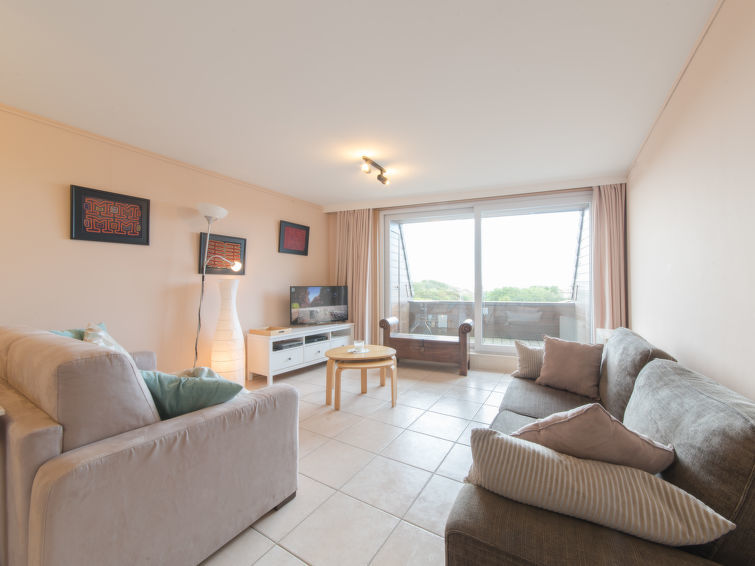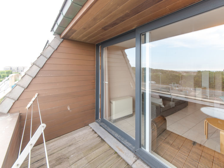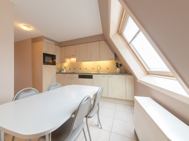 "Meiboom 503", appartement 3-kamers 120 m2 op 2 verdiepingen op de 5e verdieping. Ruim, doelmatig ingericht: open woon-/eetkamer met eettafel, TV en internationale TV-zenders (Flatscreen TV), DVD en elektrische verwarming. Keuken (afwasmachine, 4 keramische glas kookplaten, diepvriezer, elektrische koffiemachine, combimagnetron) met eettafel. Aparte WC. Elektrische verwarming. Bovenverdieping: 1 kamer met 1 bed (180 cm, lengte 200 cm). 1 kinderkamer met 1 x 2 stapelbedden (90 cm, lengte 200 cm). Bad/douche, aparte WC. Balkon 4 m2, op het noordwesten gelegen. Uitzicht op zee en De duinen. Ter beschikking: wasmachine, droger, kinderstoel, haardroger. Internet (Internet (WiFi), gratis). Garage nr. 10 (kleine wagen) (1 Auto) op 100 m. Rookmelders, brandblusser.