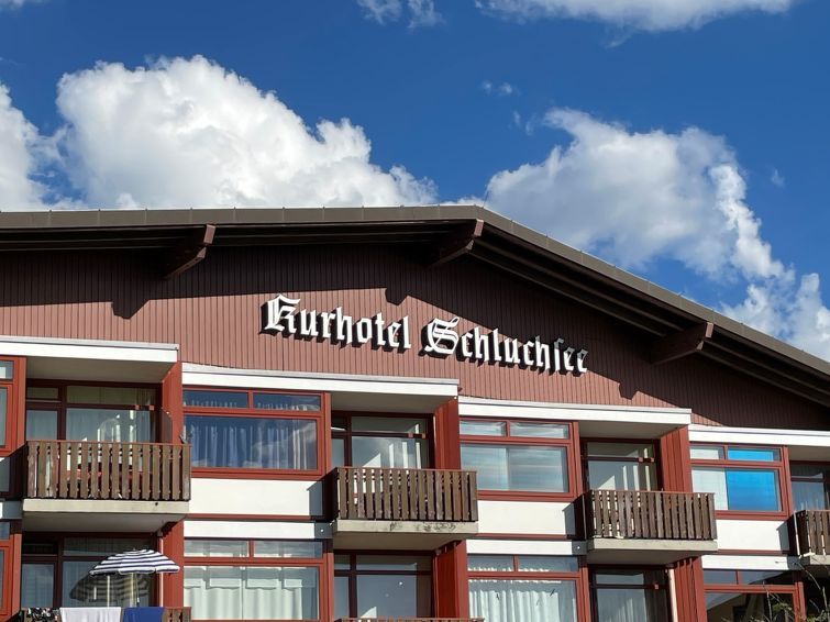 Flatgebouw "EX-Kurhotel Schluchsee", omgeven door bomen en weiden. Boven Schluchsee, 500 m van het centrum, 100 m van de bosrand, 500 m van het meer. Voor medegebruik: groot tuin met gazon en bomen, overdekt zwembad verwarmd (14 x 5 m, 130 - 140 cm diepte, openingstijden zwembad: 07:00-13:00 en 15:00-22:00). Douche/WC bij het zwembad, terras, tuinmeubelen. In het complex: salon, internetaansluiting, Internet (WiFi), sauna (extra). Fitnessruimte (extra). Biljart, speelkamer, tafelvoetbal, lift, berging voor ski's, centrale verwarming, wasmachine (extra), droger (voor medegebruik, extra). Parkeerplaats bij het huis, gemeenschappelijke garage bij het huis. Winkel, levensmiddelenwinkel, supermarkt 600 m, winkelcentrum 10 km, restaurant, bakkerij, café 600 m, fietsverhuur 500 m, centrum te voet bereikbaar in 10 minuten, bushalte 50 m, treinstation 800 m, zandstrand 500 m, 300 m, openluchtzwembad 800 m, meer (zwemmen) 500 m, meer Schluchsee 500 m. Zeilschool 800 m, tennis, tennishal 200 m, wandelroutes 1 m vanaf het huis, fietspad 50 m, skilift 2 km, rodelbaan 50 m, langlaufloipe 200 m, kinderspeelplaats 50 m, Vismogelijkheden 3 km. Attracties in de buurt: Staatsbrauerei Rothaus 10 km, Schwarzwaldhaus der Sinne 10 km, Dom St. Blasien 15 km, Badeparadies Titisee-Neustadt 25 km, Freiburg 55 km, Spasspark Hochschwarzwald 500 m. Bekende skigebieden kunnen gemakkelijk worden bereikt: Feldberg / Hochschwarzwald 20 km. Bekende meren kunnen gemakkelijk worden bereikt: Schluchsee 500 m, Titisee 25 km. Wandelgebied Schluchseer Jägersteig 1 km, Rothauser Land 8 km, Schluchseegebiet / Feldberggebiet.