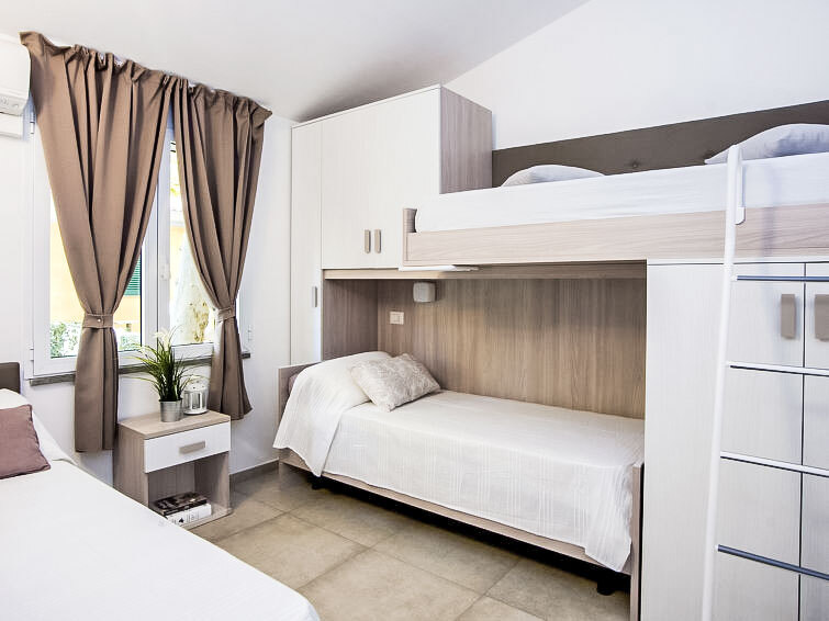 "De Luxe Plus", huis 3-kamers 40 m2, op de begane grond. Het objekt is geschikt voor 4 volwassenen + 2 kinderen. Comfortabel ingericht: woon-/eetkamer met TV. Uitgang naar de tuin, naar de veranda. 1 2-pers. kamer. 1 kamer met 1 bed en 1 x 2 stapelbedden. Kookhoek (4-pits kookplaat, afwasmachine). Douche/bidet/WC, aparte WC. Air-conditioning. Zithoek in de tuin 12 m2, groot tuin. Terrasmeubelen. Ter beschikking: kluis, haardroger. Internet (Internet (WiFi), gratis). Oplaadstation. Privé ingang. IT053006B1ZWQW8ZUA