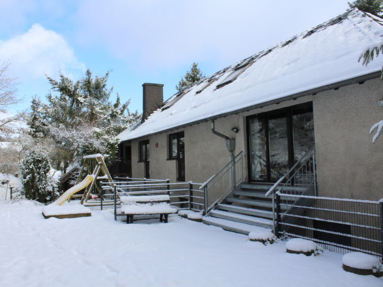 Huis met 3 woningen "Eifelnatur (Haus 2)", omgeven door bomen en velden. Aan de rand van de plaats, 300 m van het centrum, rustige, verhoogde ligging tegen een helling, 10 m van de bosrand, 8 km van het meer, aan een doodlopende weg, te midden van groen. Voor medegebruik: terrein 1.350 m2, verzorgde tuin 450 m2 met gazon 300 m2, bloemen. Tafeltennis, kinderspeelplaats (glijbaan, schommel, zandbak). In het huis: sauna (extra). Biljart, tafelvoetbal, bergruimte voor fietsen, centrale verwarming, wasmachine (voor medegebruik). Wissel van linnengoed 1 maal per week. Wissel van handdoeken 1 maal per week. Broodjesservice en drankjesservice op verzoek op aanvraag (extra). Trappenweg (25 treden) naar het huis. Levensmiddelenwinkel 5.3 km, supermarkt 5.3 km, winkelcentrum 5 km, restaurant 150 m, bar 5.3 km, bakkerij 5.3 km, café 5.3 km, fietsverhuur 10 km, bushalte "Lutzerath" 7 km, treinstation "Gerolstein" 23 km, openluchtzwembad 7.6 km, thermaalbad "Vulkaneifel-Therme Bad Bertrich" 13 km, meer (zwemmen) 7.6 km. Golfterrein (18 holes) 40 km, tennis 3.5 km, midgetgolf 7.8 km, manege 10 km, wandelroutes 50 m vanaf het huis. Attracties in de buurt: Vulkanmaare, Vulkanmuseum, Kreuzweg, Strohner Märchen, Wildpark Daun, Adler- und Wolfspark Kasselburg. Bekende meren kunnen gemakkelijk worden bereikt: Pulvermaar 1.5 km. Wandelgebied Eifelsteig 15 km. Auto noodzakelijk. De eigenaar accepteert geen jeugdgroepen. Laden en lossen van de baggage is mogelijk bij het huis. De omgeving is gevoelig voor geluidsoverlast. Gelieve geen lawaai te maken en de rust te bewaren.