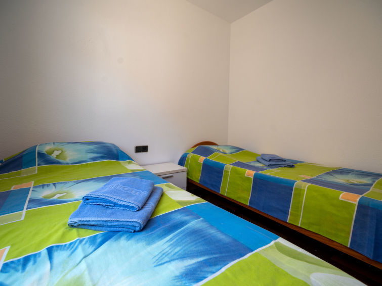 "Gregal", huis in een rij 4-kamers 80 m2 op 2 verdiepingen. Het objekt is geschikt voor 4 volwassenen + 2 kinderen. Doelmatig en comfortabel ingericht: woon-/eetkamer met Digitale TV. Uitgang naar de zitplaats in de tuin. Keuken (oven, 3 keramische glas kookplaten, broodrooster, magnetron, elektrische koffiemachine). Aparte WC. Geen verwarmingsmogelijkheid. Bovenverdieping: 1 kamer met 1 2-pers bed (1 x 150 cm, lengte 190 cm), douche/WC en air-conditioning. 1 kamer met 2 bedden (90 cm, lengte 190 cm). 1 kamer met 1 2-pers bed (1 x 140 cm, lengte 190 cm), ventilator. Douche/WC. Olie-verwarming. Terrasmeubelen, barbecue. Uitzicht op de tuin. Ter beschikking: wasmachine, strijkijzer, haardroger. Internet (Internet (WiFi), gratis). Rookvrij huis. TV alleen ES. HUTT-046001